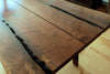 Tables are finished with poly and hand-rubbed beeswax, the steel legs are welded right here in our shop and the walnut feet are inset. The tables also feature beautifully charred edges and butterfly joinery, I'm sure you're gonna dig it.