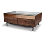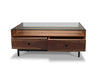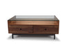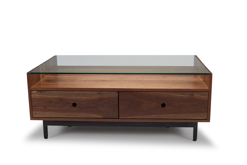 We designed our newest coffee table with two lower drawers because let's face it: nobody likes looking at a table top cluttered with old magazines and remote controls. Tables are framed in sustainably harvested American hardwoods (walnut pictured), glass options include both clear and smoked, the base is blackened steel finished with a durable clear coat.