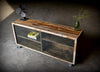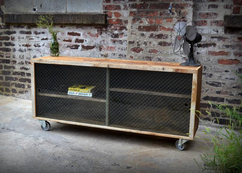 In this case that reclaimed wood has become a credenza, we lay complimentary pieces over a cabinet-grade birch frame and then add the sliding glass doors. There are handmade hairpin legs or steel casters underneath, we finish the wood with poly and hand-rubbed beeswax while the steel gets a clear-coat to protect against future rusting. Interior shelves are adjustable, there are holes drilled at the back of each compartment to allow for cord access, credenzas measuring 60" and larger will have a center shelf bay. If you plan to use electronics in this piece, let us know where you would like cable-pass holes to be drilled. We can recommend locations if you're unsure.
