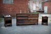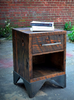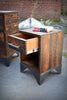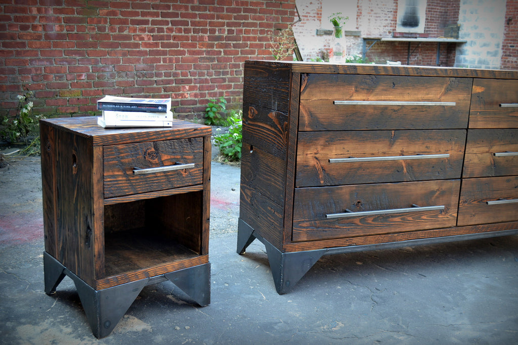 Our single column Brooklyn nightstand(18x18x26) is made using material cut from the floor beams we salvage all over the greater NYC area. We lay complementary pieces over a cabinet-grade birch frame so that they're built to last. The drawers open on standard furniture slides and the base is a welded steel design of our own, we finish each piece with poly and hand-rubbed beeswax. The steel gets a clear-coat to protect against future rusting, there are levelers on each foot for those of us with imperfect floors.