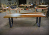 Tops are white pine that can be finished in any number of shades, the X-frame bases are recycled iron welded right here in our shop. We finish each top with poly and hand-rubbed beeswax, the steel gets a clear-coat to protect against future rusting, there are levelers on each foot for those of us with imperfect floors.